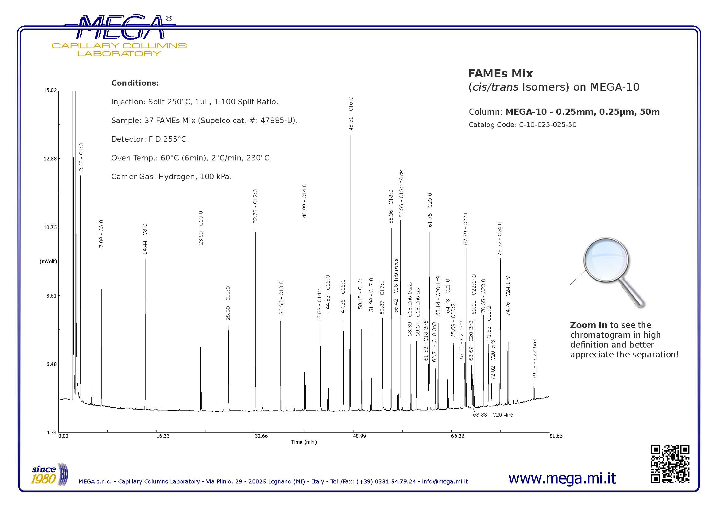 1,以50米長度的MEGA-10石英毛細管柱分離37種脂肪酸甲酯,效果可以媲美其它品牌50米長度的產品,不僅縮短了分離時   間,而且大大降低了產品成本。