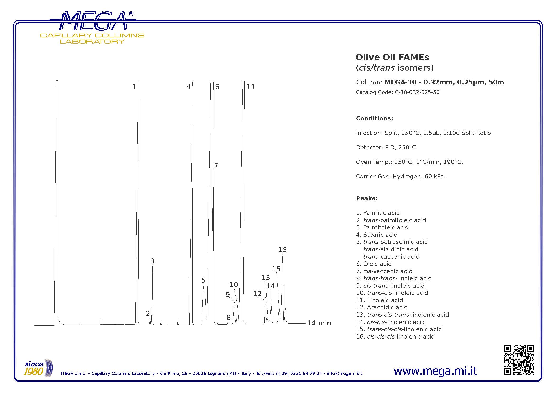 意大利MEGA公司(中文“美佳”)具有30多年專業生產和研發氣相色譜石英毛細柱的企業,其產品之一MEGA-10毛細管柱可以滿足此標準的要求,規格:50m x 0.25mm  0.20um df,可以很好分離標準中規定的5種脂肪酸。與使用其它品牌100m x 0.25mm  0.20um df色譜柱相比,優越性在于: