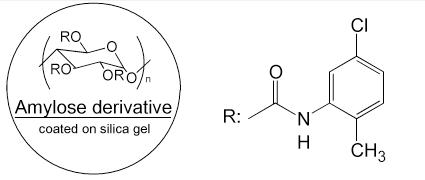 纖維素型是使用最廣泛的手性柱之一,纖維素型手性色譜柱的分離作用包括相互吸引的作用及形成包埋復(fù)合物。它們屬于Wainer分類中的第2種類型。市售的手性色譜柱為微晶三醋酸基、三安息香酸基、三苯基氨基酸鹽纖維素固定相。很多化合物可通過(guò)此類型的色譜柱得到分離。這種類型的手性色譜柱種類也很齊全。流動(dòng)相使用低極性溶劑,典型的流動(dòng)相為異丙醇-正己烷混合物。這類柱子根據(jù)制作工藝,分為涂敷與鍵合兩大類。但特別要注意由于氯可以使涂敷纖維素從硅膠上脫落,因此要確保涂敷類柱子流動(dòng)相中無(wú)含氯溶劑。