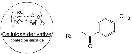 纖維素型是使用最廣泛的手性柱之一,纖維素型手性色譜柱的分離作用包括相互吸引的作用及形成包埋復合物。它們屬于Wainer分類中的第2種類型。市售的手性色譜柱為微晶三醋酸基、三安息香酸基、三苯基氨基酸鹽纖維素固定相。很多化合物可通過此類型的色譜柱得到分離。這種類型的手性色譜柱種類也很齊全。流動相使用低極性溶劑,典型的流動相為異丙醇-正己烷混合物。這類柱子根據制作工藝,分為涂敷與鍵合兩大類。但特別要注意由于氯可以使涂敷纖維素從硅膠上脫落,因此要確保涂敷類柱子流動相中無含氯溶劑。