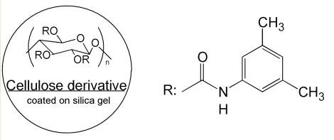 纖維素型是使用最廣泛的手性柱之一,纖維素型手性色譜柱的分離作用包括相互吸引的作用及形成包埋復合物。它們屬于Wainer分類中的第2種類型。市售的手性色譜柱為微晶三醋酸基、三安息香酸基、三苯基氨基酸鹽纖維素固定相。很多化合物可通過此類型的色譜柱得到分離。這種類型的手性色譜柱種類也很齊全。流動相使用低極性溶劑,典型的流動相為異丙醇-正己烷混合物。這類柱子根據(jù)制作工藝,分為涂敷與鍵合兩大類。但特別要注意由于氯可以使涂敷纖維素從硅膠上脫落,因此要確保涂敷類柱子流動相中無含氯溶劑。